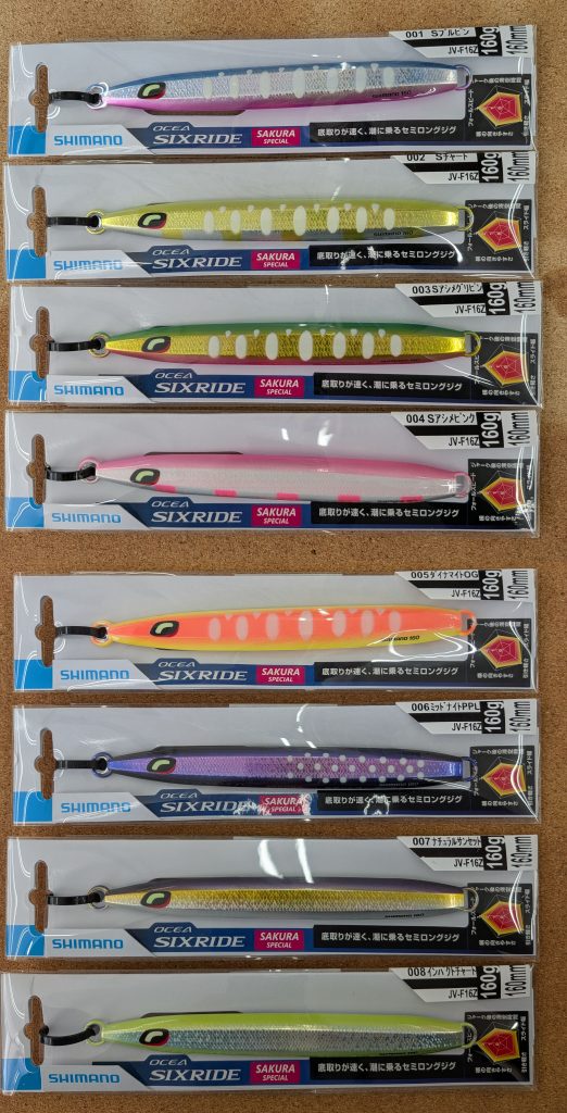 ↑ サイズ:140g/139mm・160g/160mm カラー:Sブルピン・Sチャート・Sアシメグリピン・Sアシメピンク・ダイナマイトOG・ミッドナイトPPL・ナチュラルサンセット・インパクトチャート リアバランスセイロングジグ、シックライドのサクラマスカラーver.が入荷しました。
