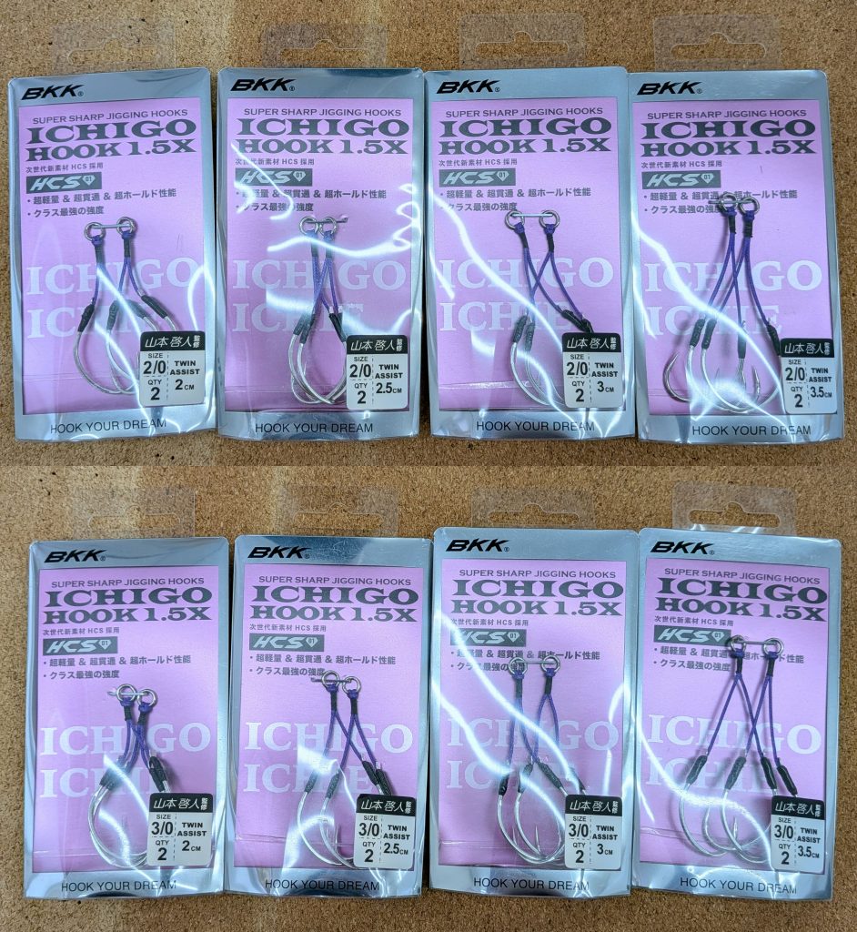 ↑ フックサイズ:2/0・3/0 アシストライン全長:2cm・2.5cm・3cm・3.5cm ICHIGO HOOKを使用したアシストフックが入荷しました。 サクラマスジギングにオススメです。